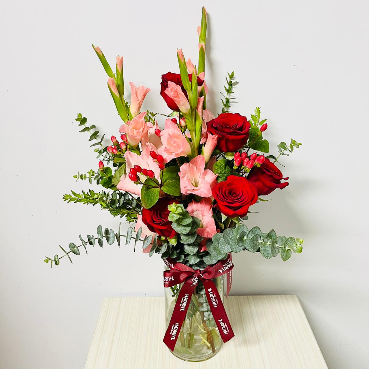 Arreglo de 4 rosas rojas, gladiolos rosados y follajes naturales en florero tubular de vidrio. Ideal para demostrar cariño y ternura al ser apreciado. Precio Incluye tarjeta para dedicatoria, nutrientes para las flores y guía de cuidados.