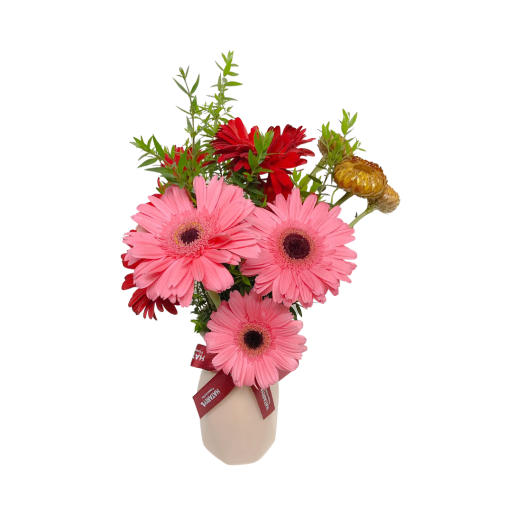 VIDA DE MI VIDA es exclusivo arreglo floral de HATARIY Flowers & Gifts. Elaborado con 6 gerberas rosadas y rojas, siempre viva y follajes en florero beige de cerámica. Precio incluye tarjeta para dedicatoria y etiqueta de cuidados. Medida Aprox.: 45cmx35cm